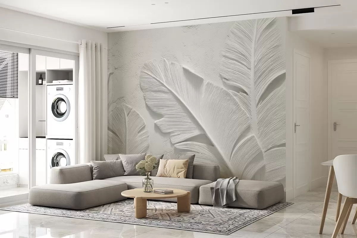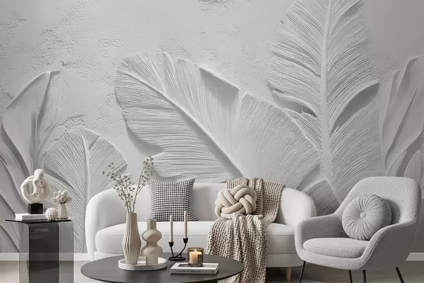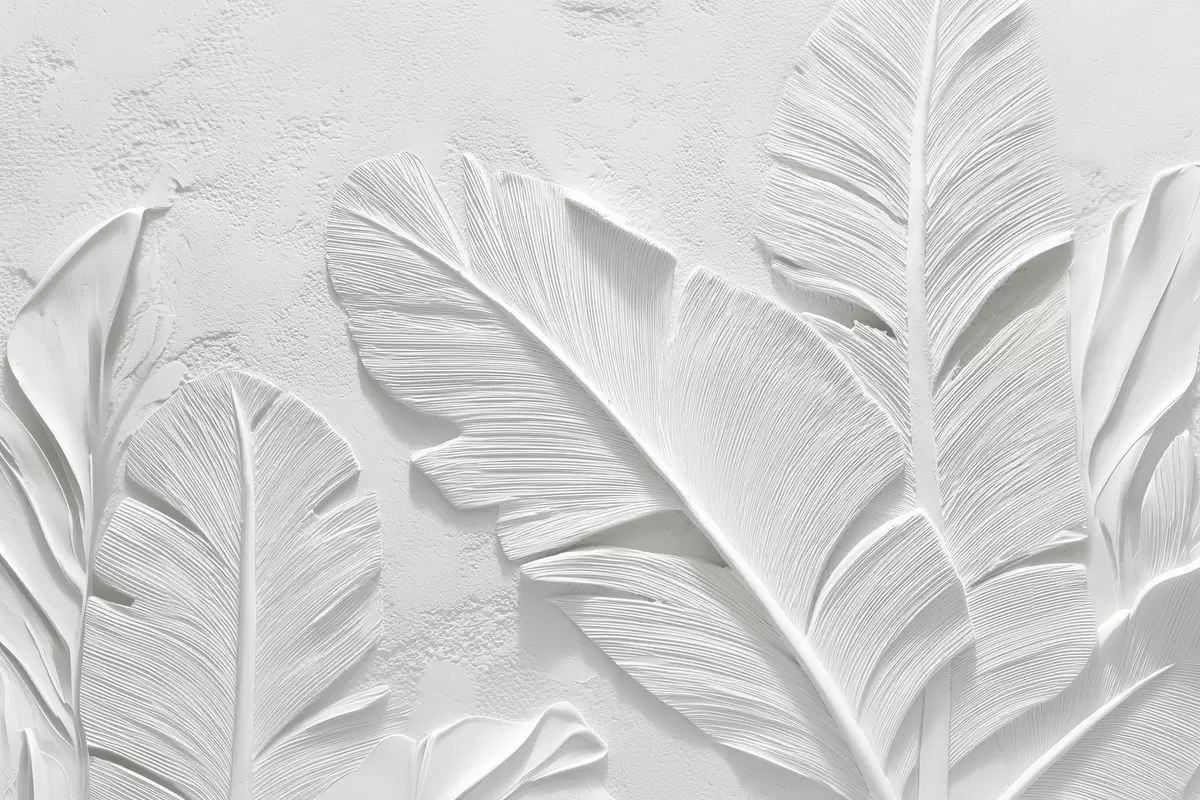 Fotobehang Grijze bladeren met structuur op een achtergrond met reliëf van imitatiepleister N° w09307