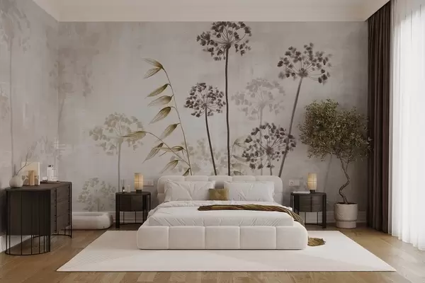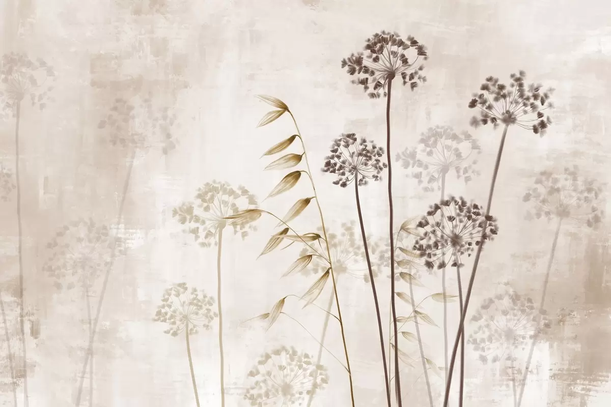 Fotobehang Gedroogde bloemen tekening met lange stelen, monochroom palet, tegen een getextureerde, lichtbeige achtergrond, botanische illustratie N° w09314v1
