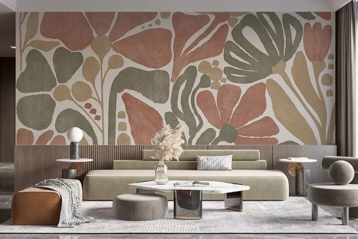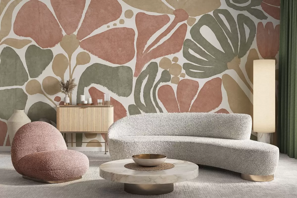 Fotobehang Abstracte bloemen in tinten rood, groen en beige, met een lichte achtergrond, in een plat, gestileerd modern minimalistisch ontwerp N° w09315
