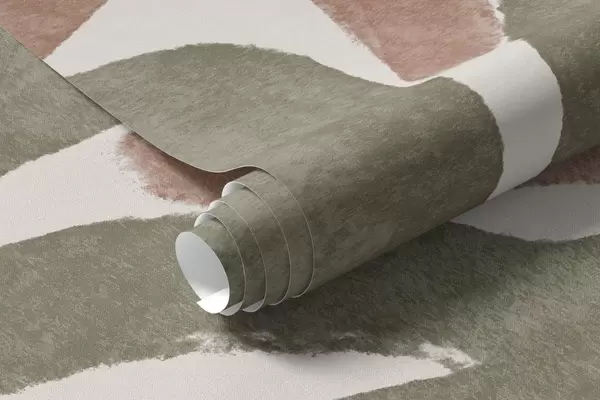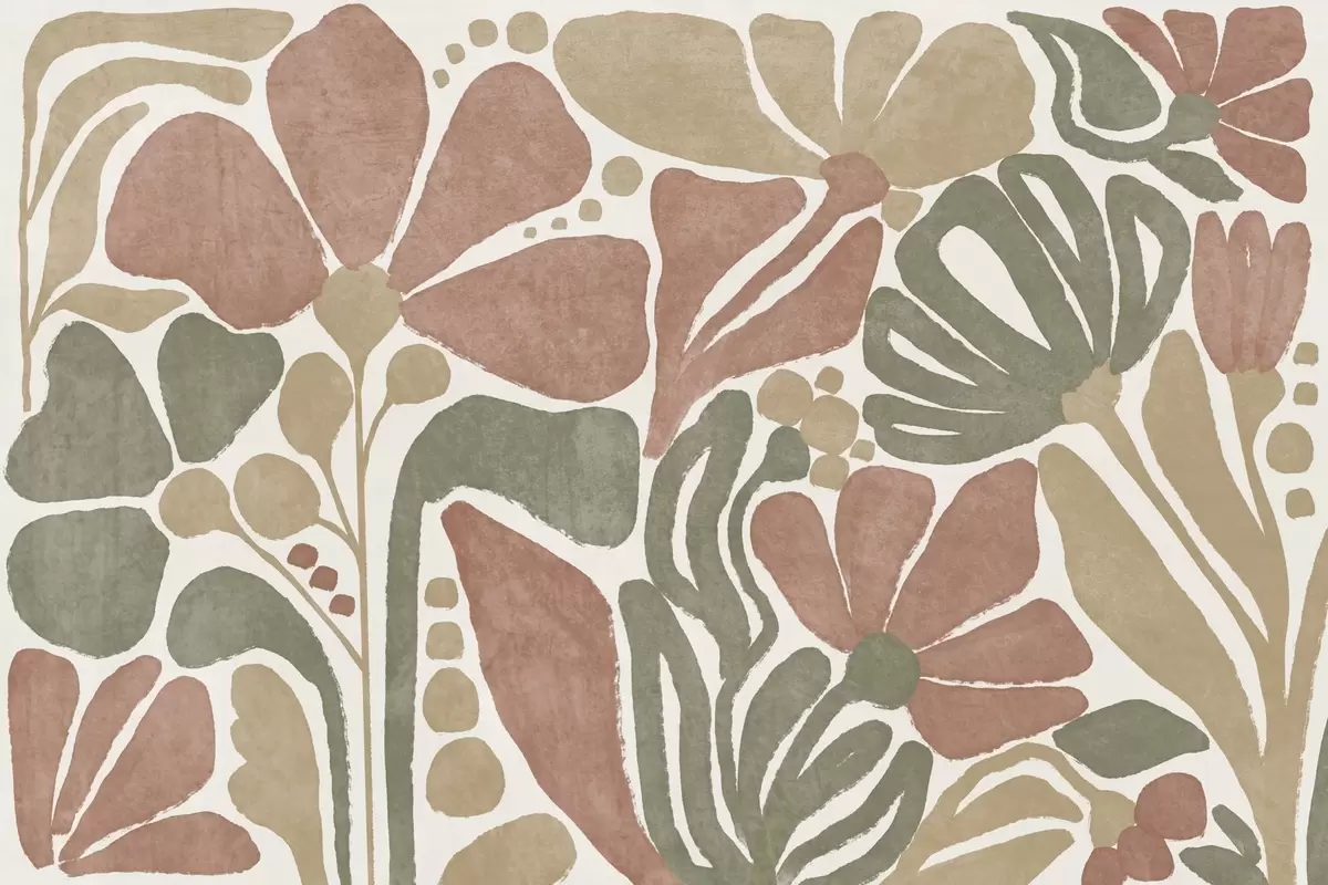 Fotobehang Abstracte bloemen in tinten rood, groen en beige, met een lichte achtergrond, in een plat, gestileerd modern minimalistisch ontwerp N° w09315