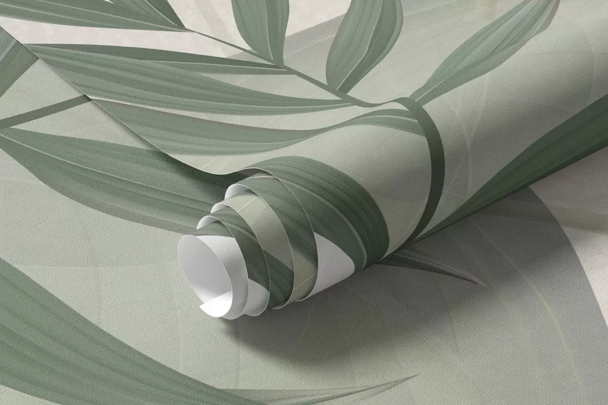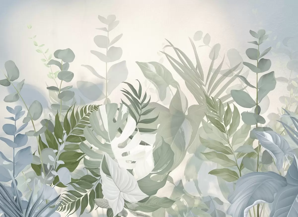 Fotobehang Pastelgroene planten varens, monstera en eucalyptus, lichte getextureerde achtergrond, zachte verlichting, vredig , botanische illustratie N° w09316