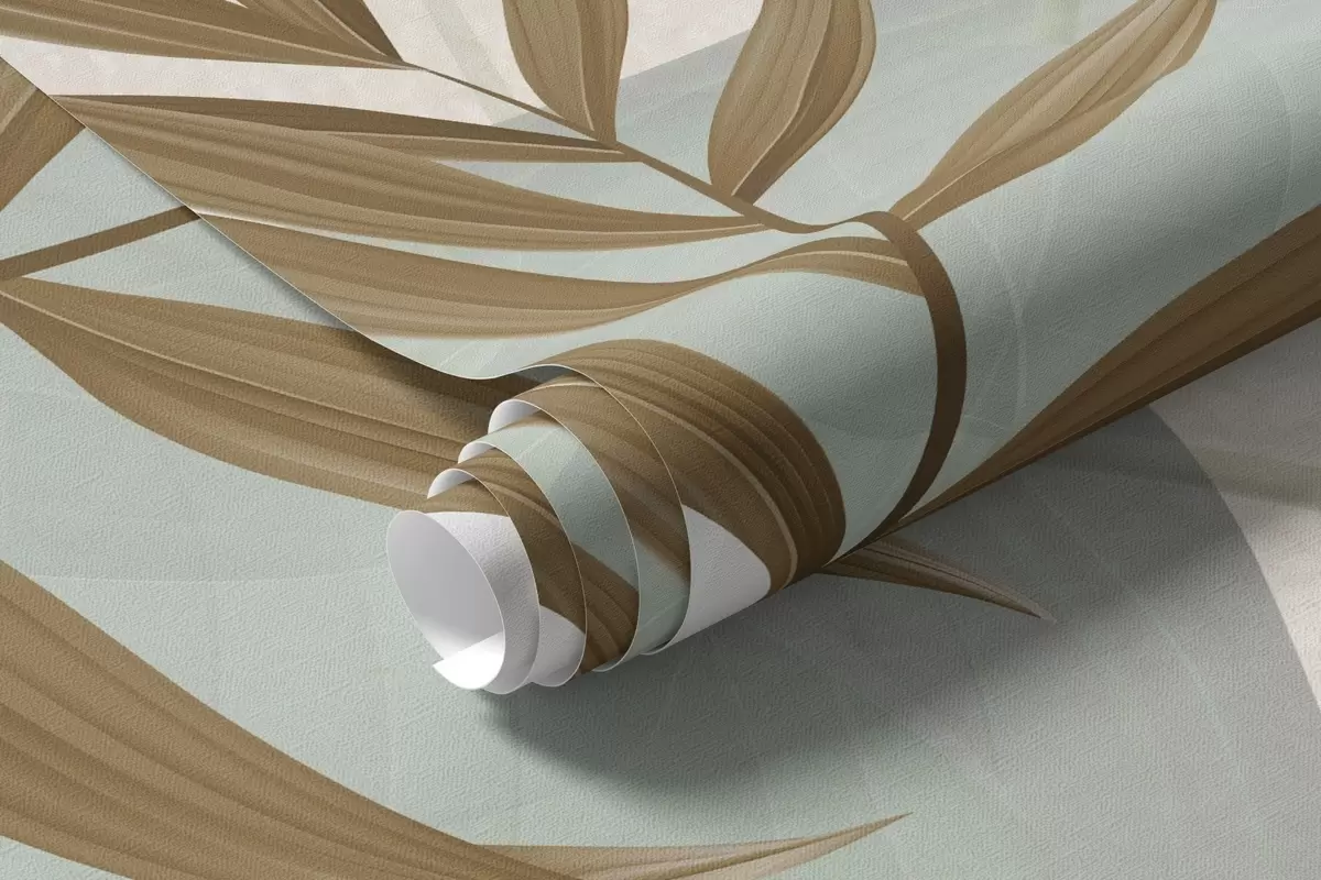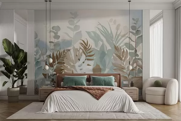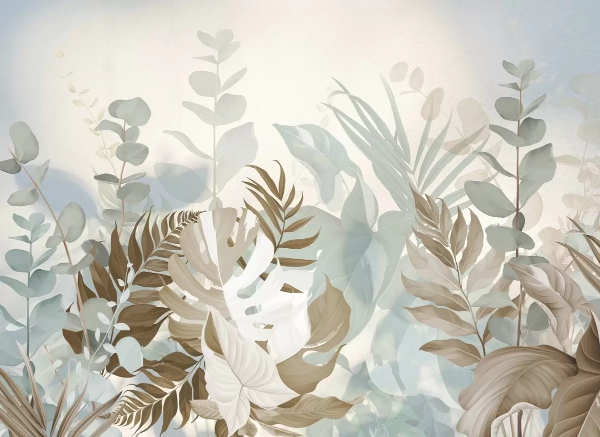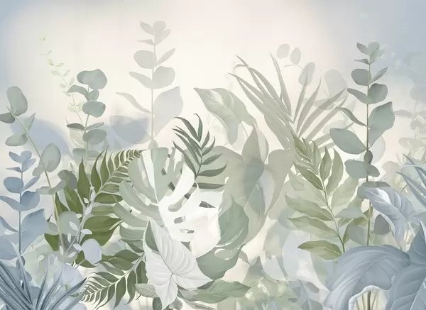 Fotobehang Pastel planten varens, monstera en eucalyptus, lichte getextureerde achtergrond, zachte verlichting, vredig , botanische illustratie N° w09316v1