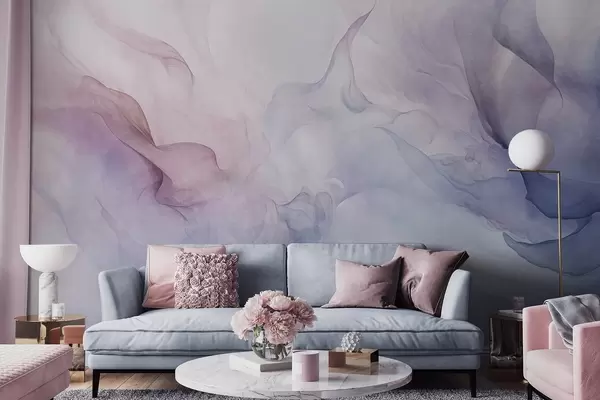 Fotobehang Abstract getextureerd schilderij met vloeiende pasteltinten roze, paars en blauw die een zacht effect creëren N° w09318
