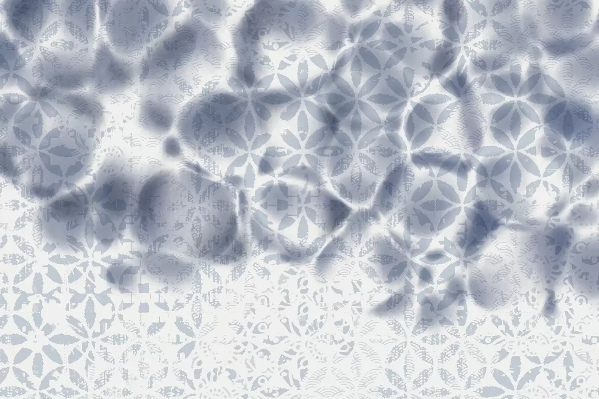 Fotobehang Abstract getextureerde kunst met blauwe bloemenprint, vervaagd en onscherp effect, waardoor een zachte en dromerige sfeer ontstaat N° w09322