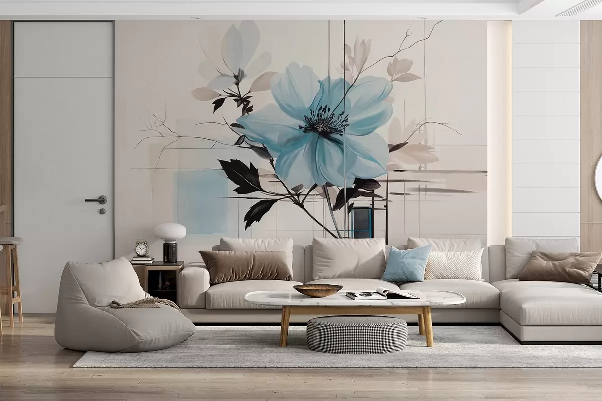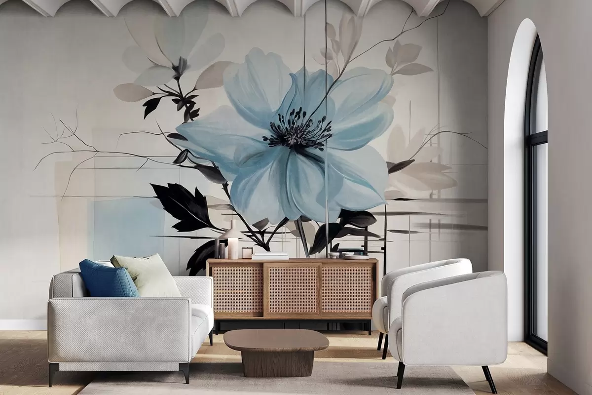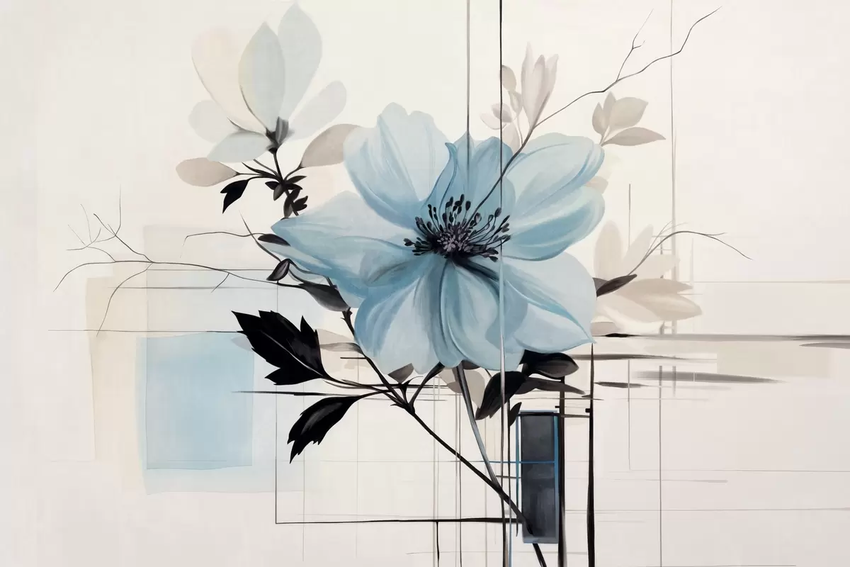 Fotobehang Abstracte getextureerde blauwe bloem met donkere bladeren en takken, geometrische minimalistische vormen en lijnen in gedempte kleuren N° w09332