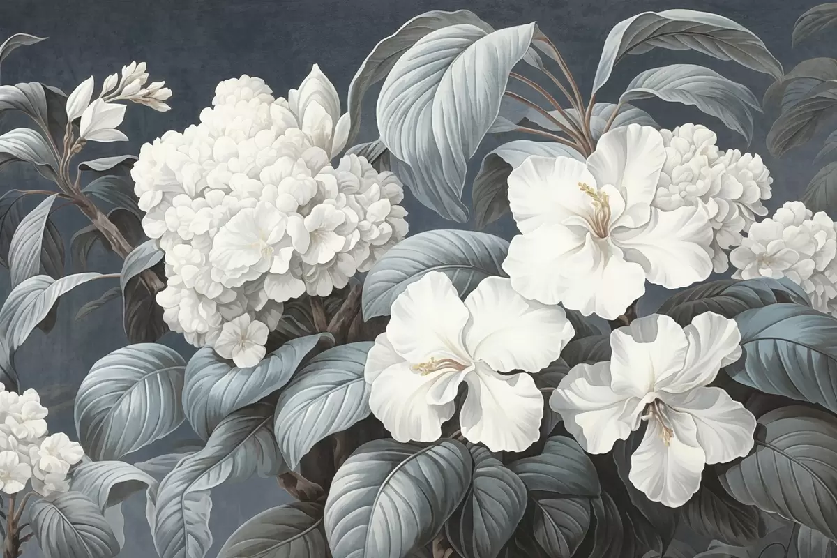Fotobehang Witte tropische bloemen met delicate bloemblaadjes en bladeren op een donkerblauwe achtergrond, vintage textuurstijl, botanische illustratie N° w09334
