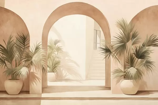 Fotobehang Bogen met structuur en potplanten, lichtbeige kleurenpalet, minimalistisch ontwerp, trap op de achtergrond N° w09339