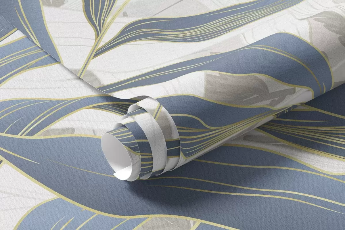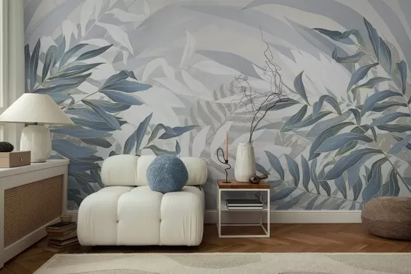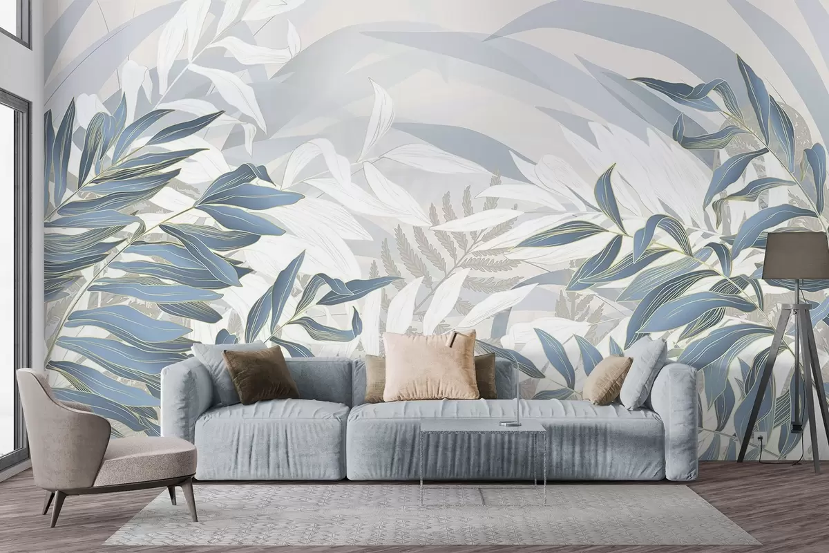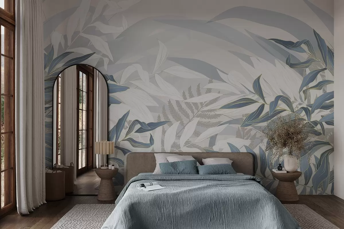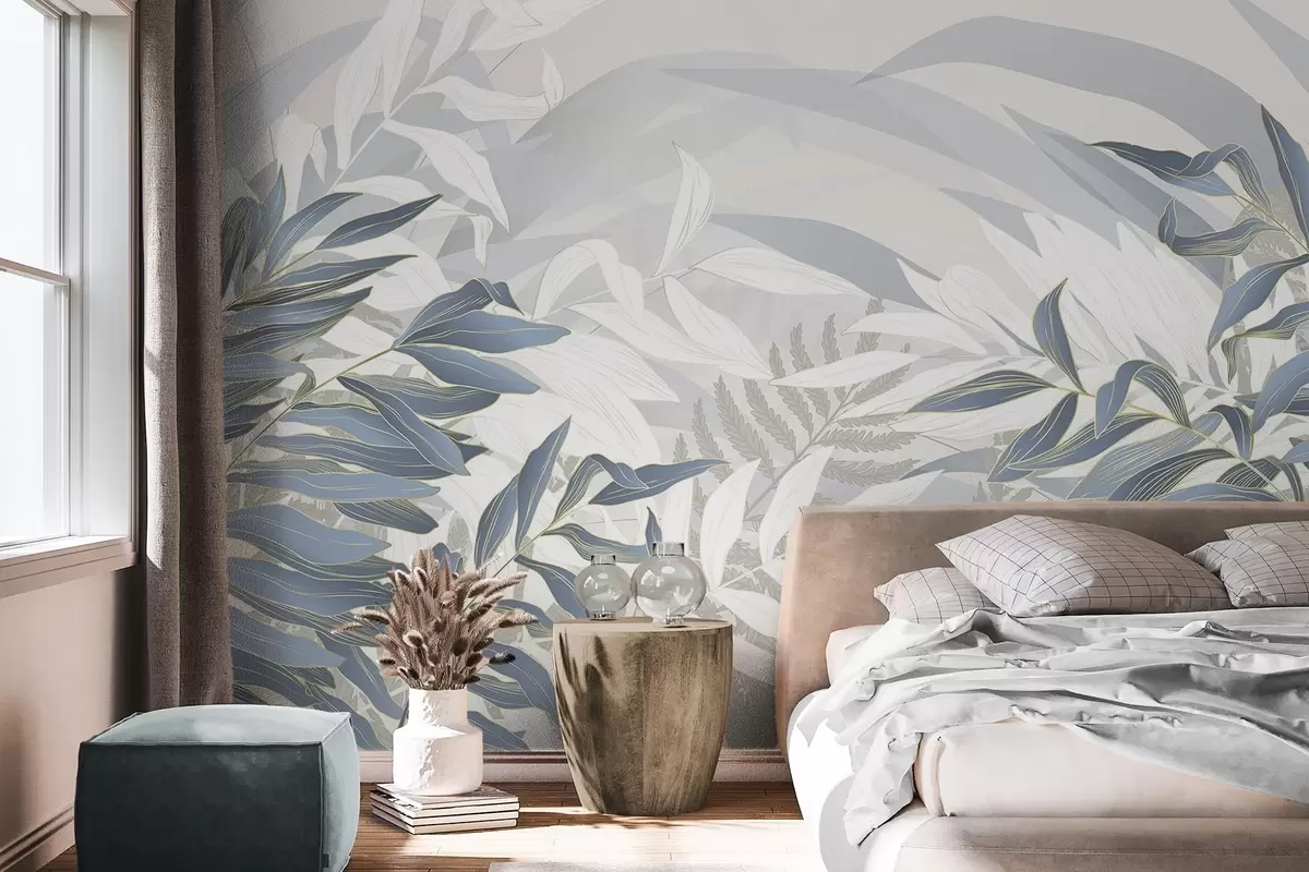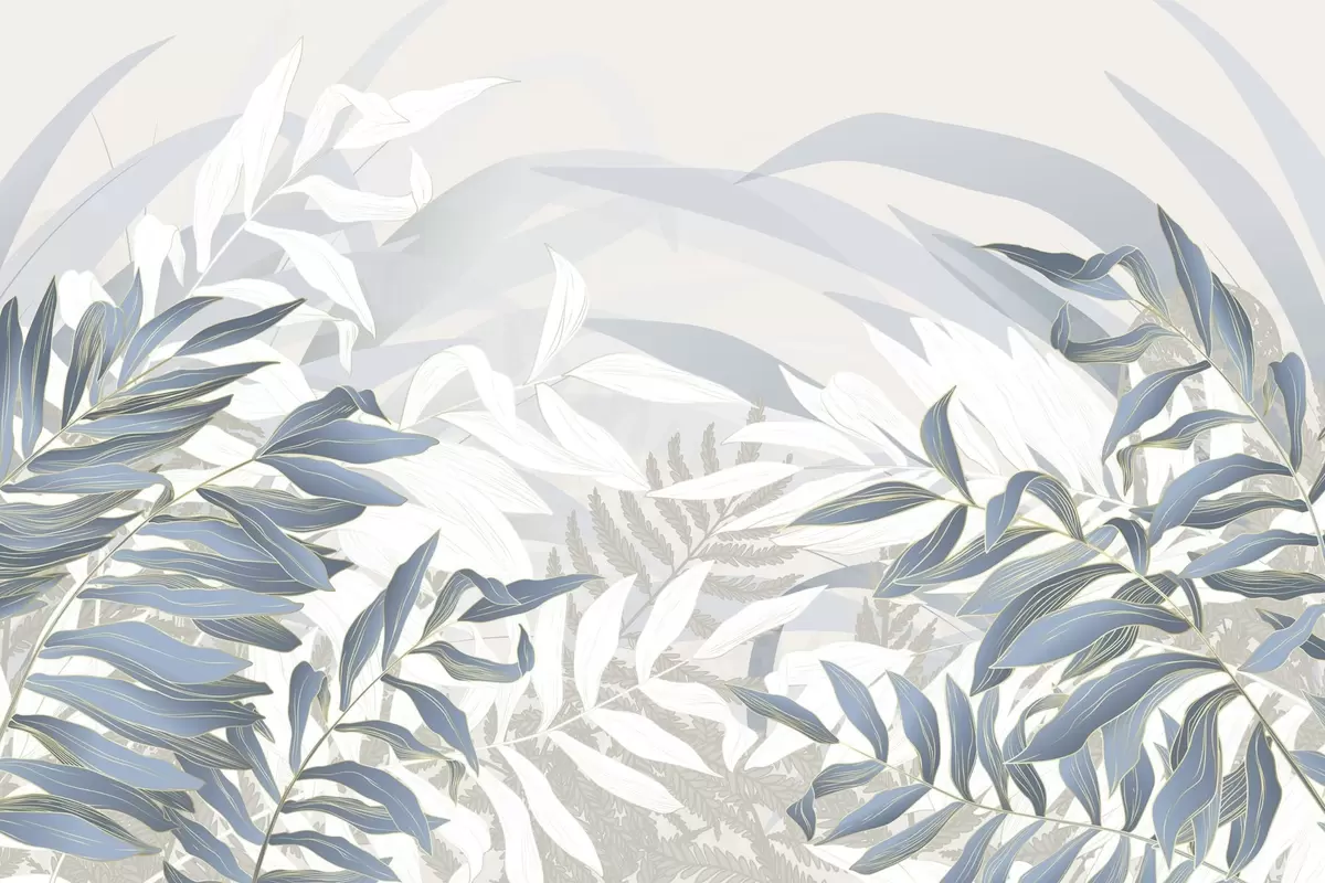 Fotobehang Blauwe en witte bladeren en gras, zachte pastelkleuren, botanische illustratie, minimalistisch ontwerp, decoratief, modern N° w09341