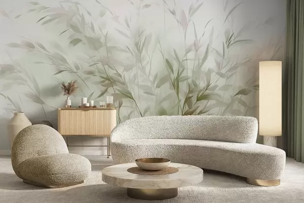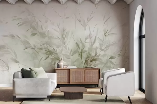 Fotobehang Gras en onkruid met dunne blaadjes en stengels, lichtgroene en bruine kleuren, zachte en fijne penseelstreken, minimalistische print N° w09342