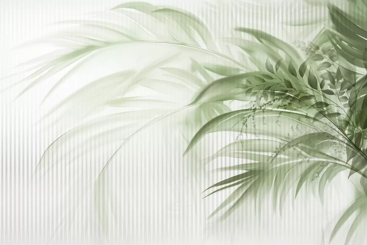 Fotobehang Tropische palmbladeren met een wit gestreepte achtergrond, zachte verlichting, fijne penseelstreken, organische vormen N° w09343