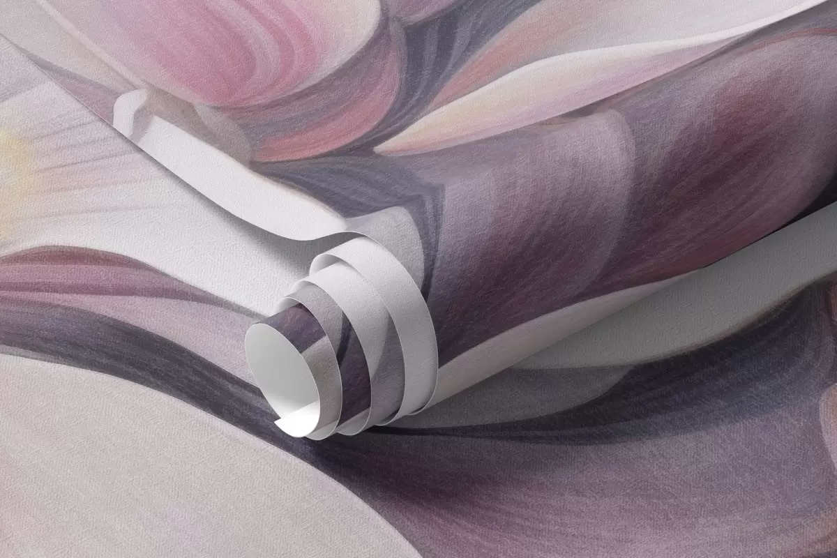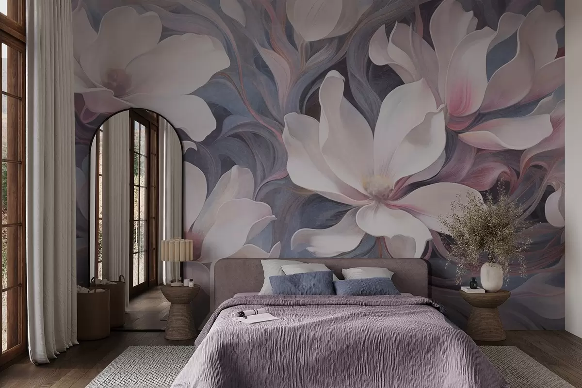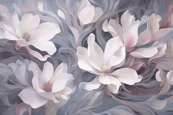 Fotobehang Textuurschilderij van witte magnoliabloemen met roze accenten tegen een achtergrond van wervelende, gedempte blauwe en grijze tinten N° w09344