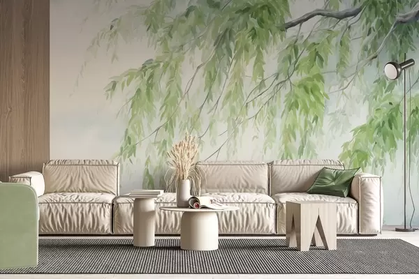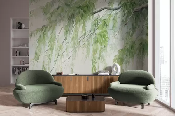 Fotobehang Treurwilgentakken met hangende groene bladeren, zachte en fijne penseelstreken, aquarel schilderstijl N° w09365