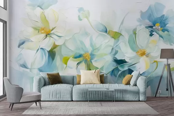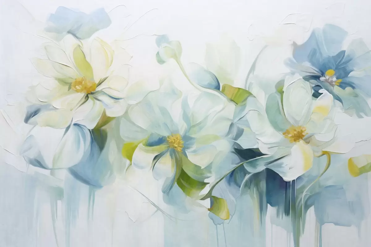 Fotobehang Abstracte witte en blauwe bloemen met gele stampers en groene bladeren, op een witte achtergrond, getextureerde schilderstijl N° w09372