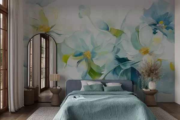Fotobehang Abstracte witte en blauwe bloemen met gele stampers en groene bladeren, op een witte achtergrond, getextureerde schilderstijl N° w09372