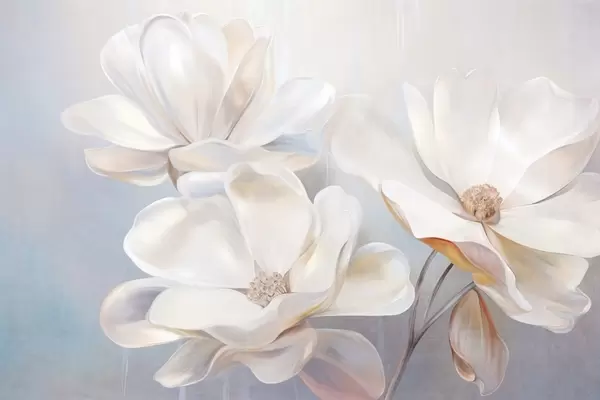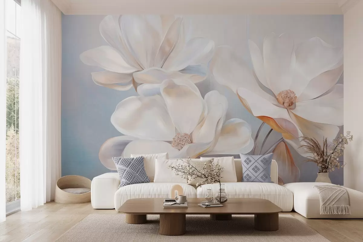 Fotobehang Witte fantasie-magnoliabloemen met delicate, gestructureerde bloemblaadjes, een zachte, abstracte achtergrond N° w09373