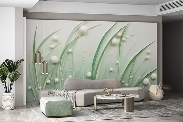 Fotobehang Abstract groen gras met witte bollen, lichtgroene achtergrond, structuur, strakke lijnen, minimalistische stijl N° w09382