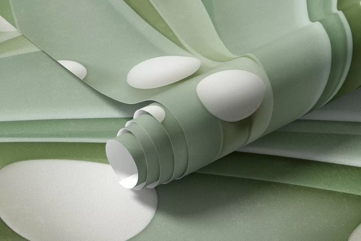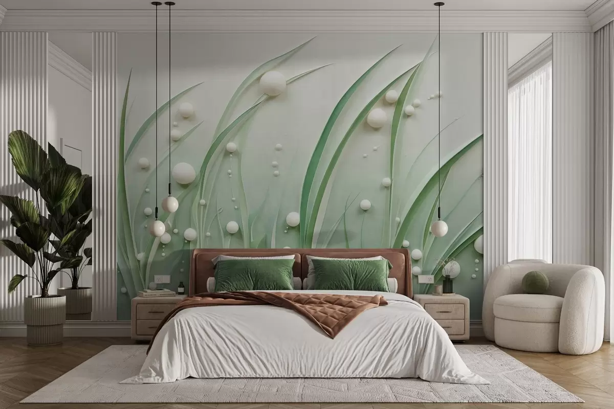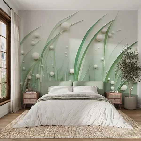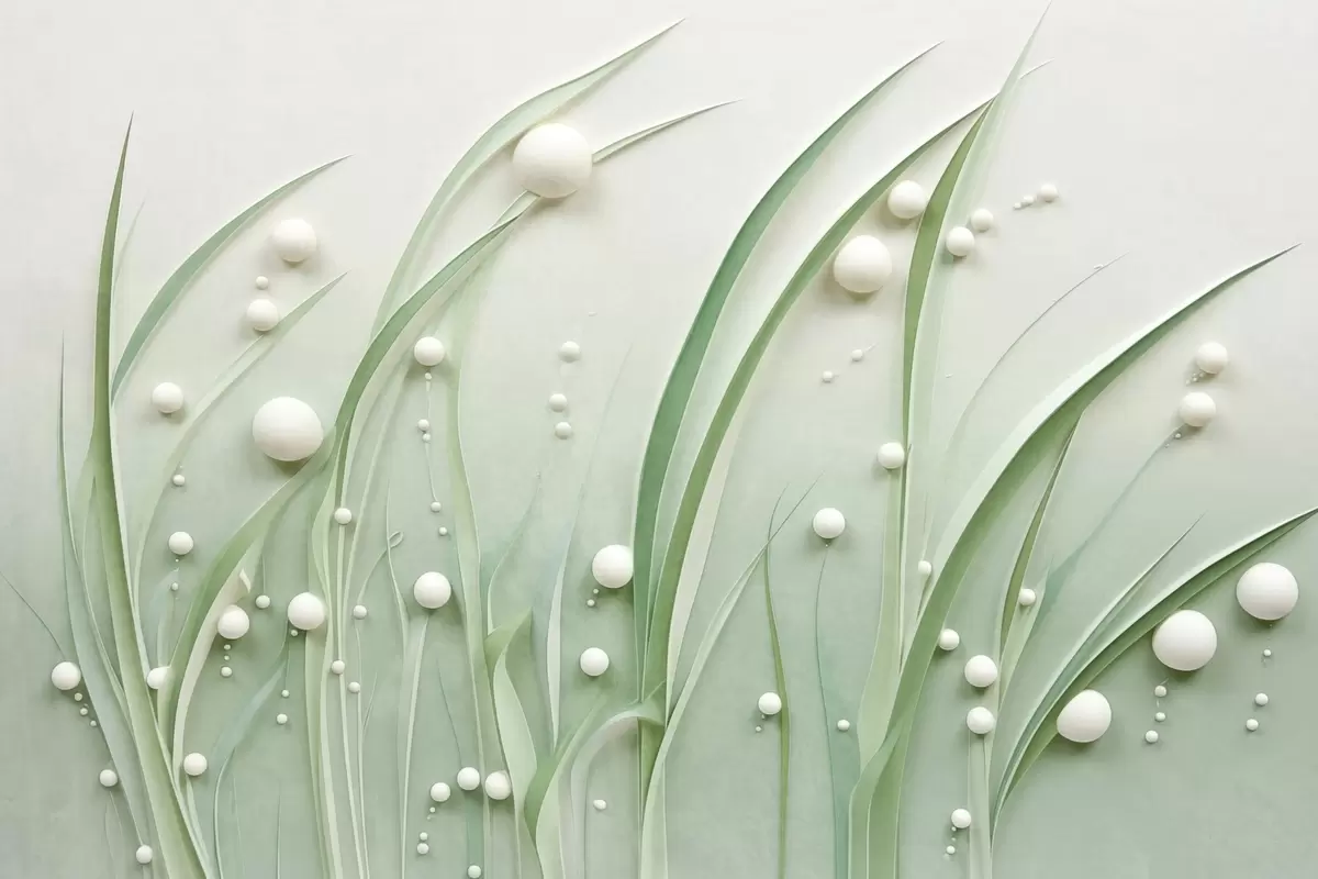 Fotobehang Abstract groen gras met witte bollen, lichtgroene achtergrond, structuur, strakke lijnen, minimalistische stijl N° w09382