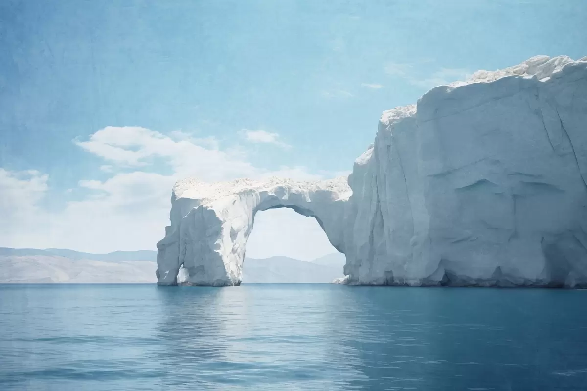 Fotobehang Landschap met natuurlijke ijsbrug over de oceaan , helderblauwe lucht met enkele wolken, getextureerde print N° w09383