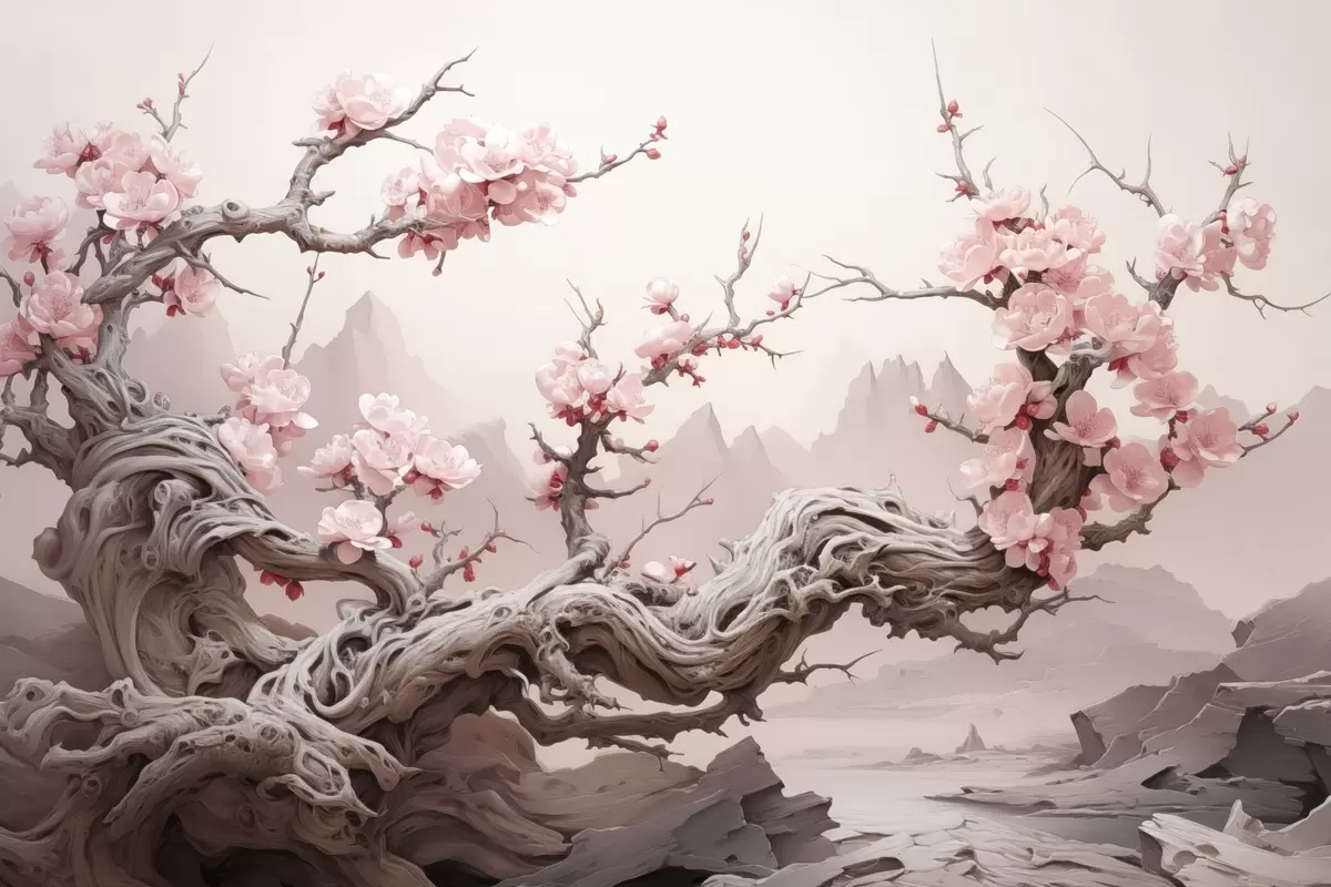Fotobehang Gedraaide boomstam met bloeiende roze sakura N° w09388