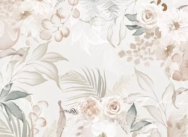 Fotobehang Bloemstuk met textuur, bestaande uit rozen, orchideeën, eucalyptus en palmbladeren in pastelkleuren, op een beige achtergrond N° w09393