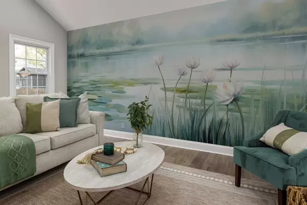 Fotobehang Landschap met een meer, waterlelies en leliebladeren, bomen op de achtergrond, in een rustige omgeving, lichtblauwe en groene tinten N° w09395