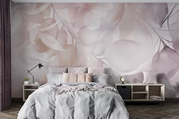 Fotobehang Bloemenkunst met gedempte beige en bruine bloemen, bladeren en takken, zachte pastelkleuren, aquarelstructuureffect N° w09397
