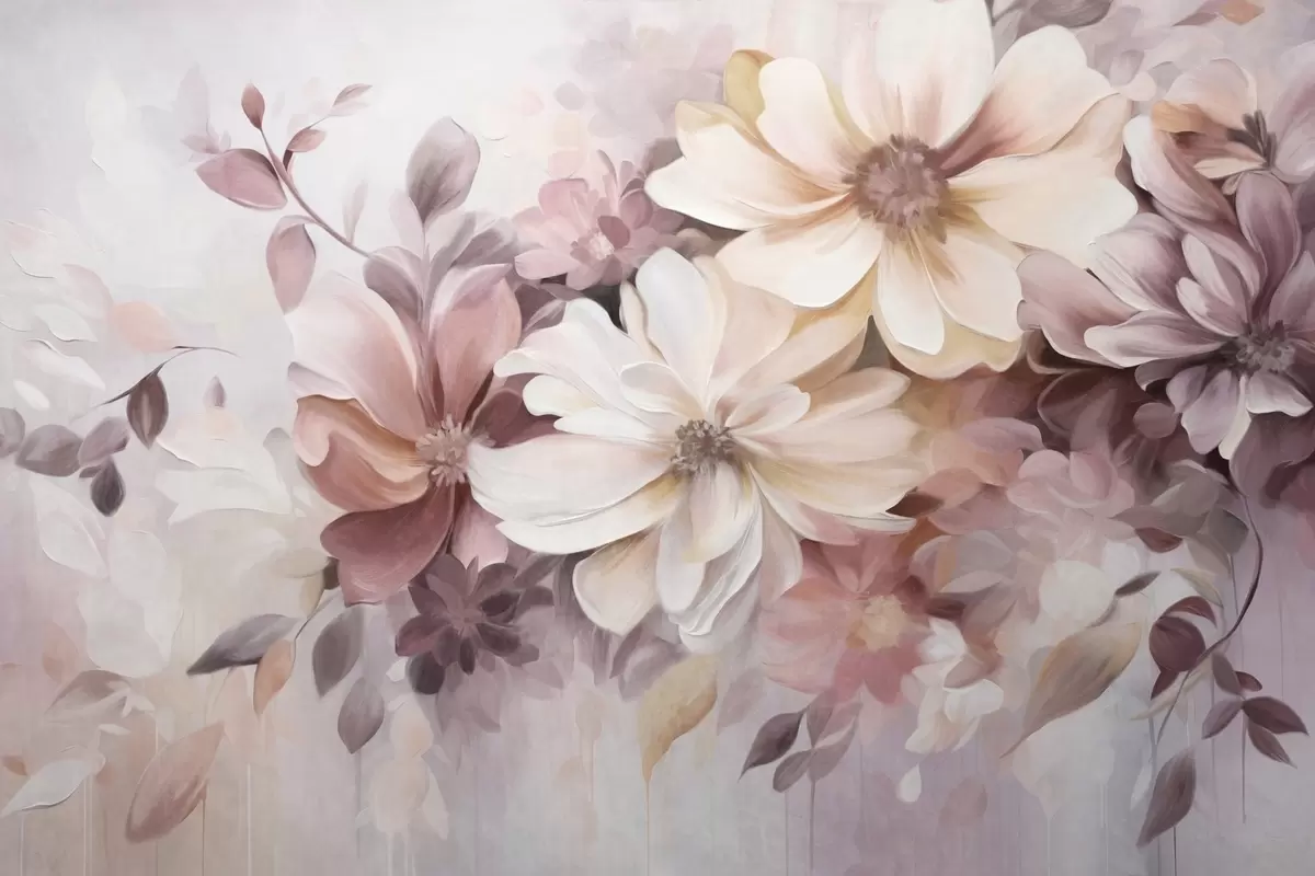 Fotobehang Een bloemstuk met grote, zachtgekleurde bloemen in bordeauxrode, perzikkleurige en witte tinten, met delicate bladeren N° w09398