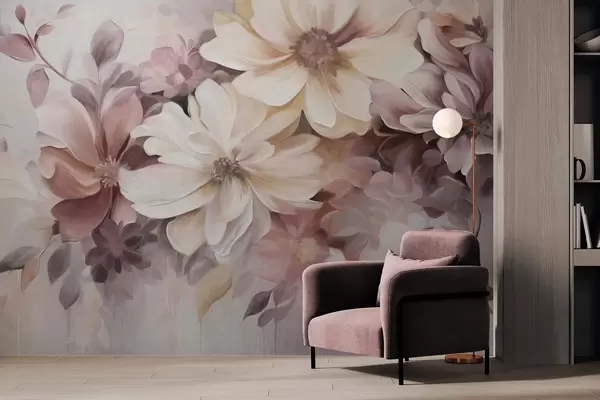 Fotobehang Een bloemstuk met grote, zachtgekleurde bloemen in bordeauxrode, perzikkleurige en witte tinten, met delicate bladeren N° w09398