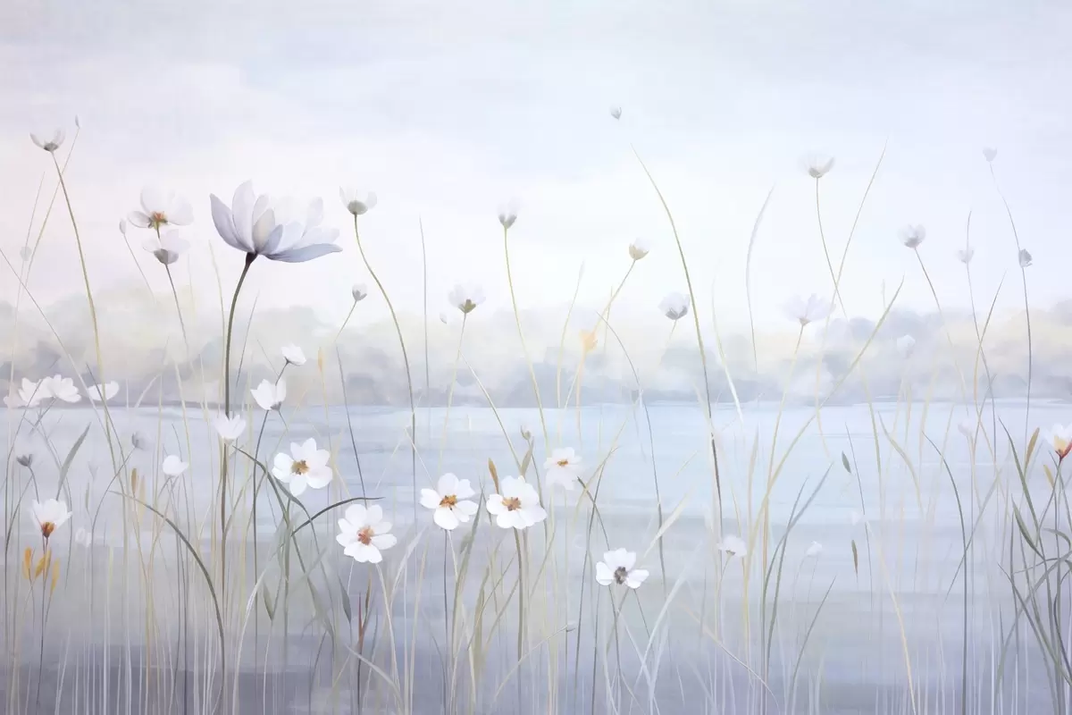 Fotobehang Witte bloemen met lange stelen in een veld, lichtblauwe lucht, zachte kleuren, gestructureerd, minimalistische stijl, geïnspireerd door de natuur, rustige achtergrond N° w09401