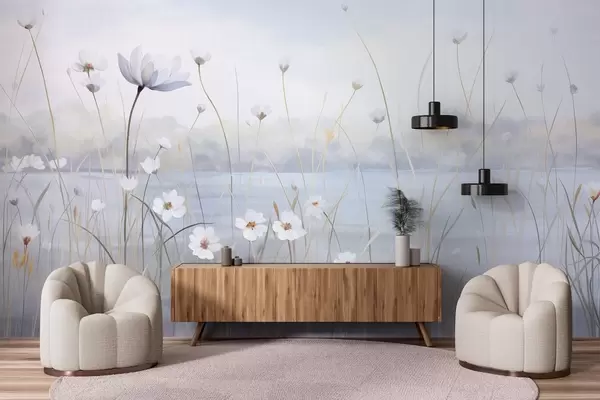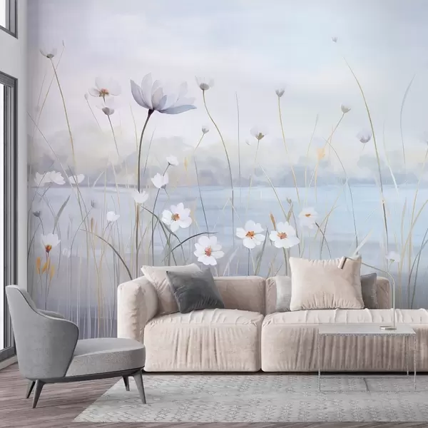 Fotobehang Witte bloemen met lange stelen in een veld, lichtblauwe lucht, zachte kleuren, gestructureerd, minimalistische stijl, geïnspireerd door de natuur, rustige achtergrond N° w09401