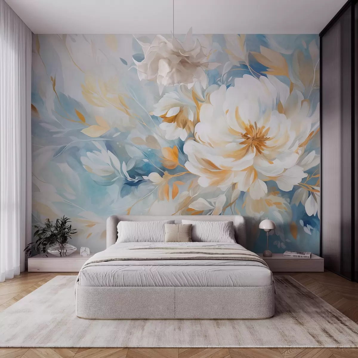 Fotobehang Witte bloem met textuur en blauwe en gele details en bladeren op een blauw-witte abstracte achtergrond, schilderstijl N° w09403