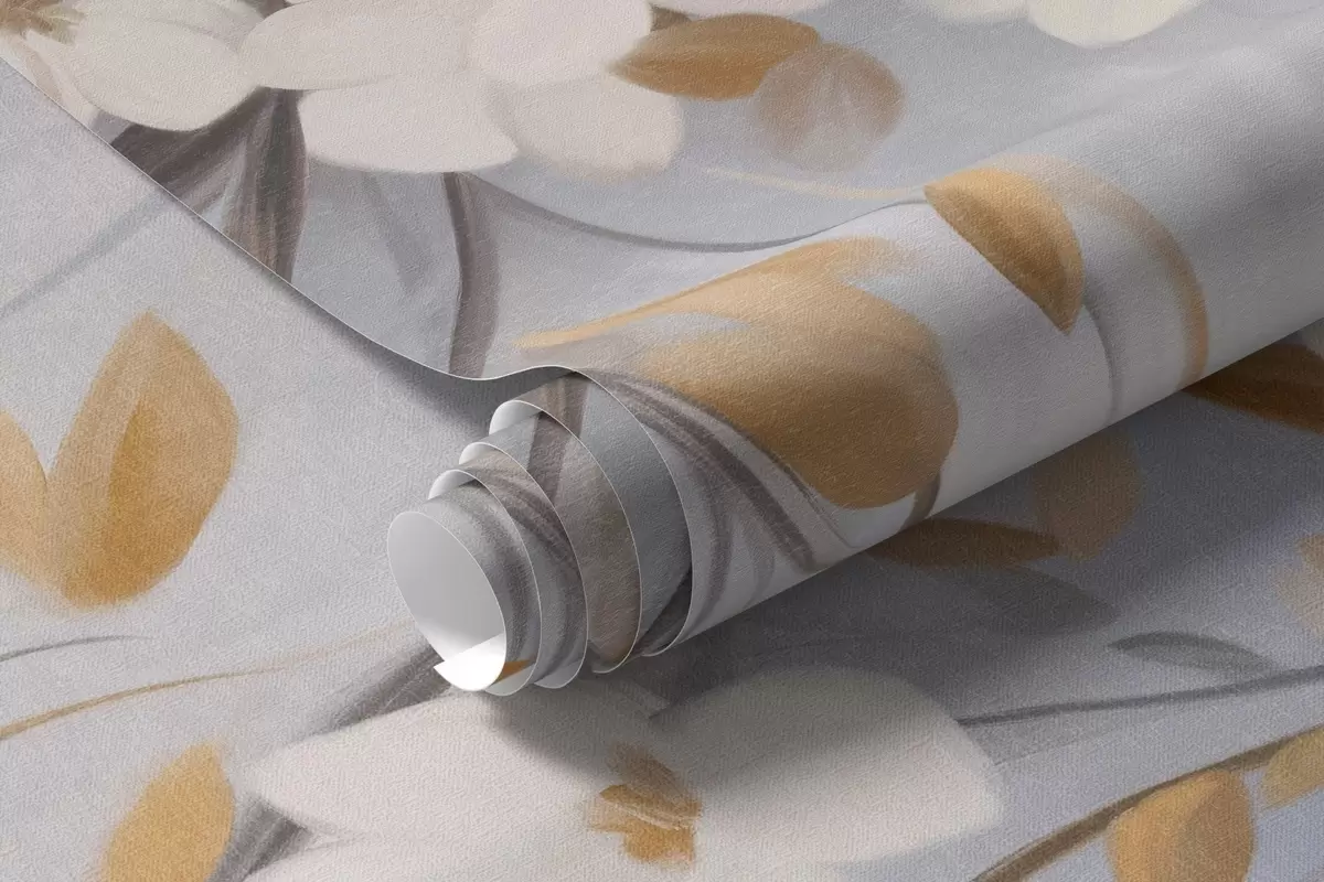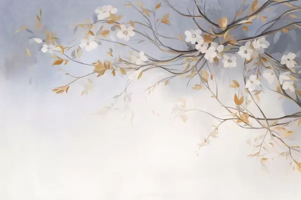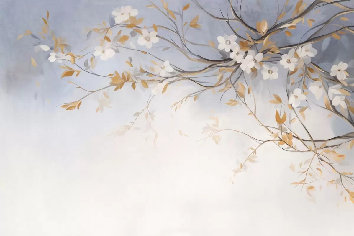 Fotobehang Witte bloemen met oranje bladeren op een boomtak, lichtblauwe achtergrond met textuur, delicate penseelstreken N° w09415