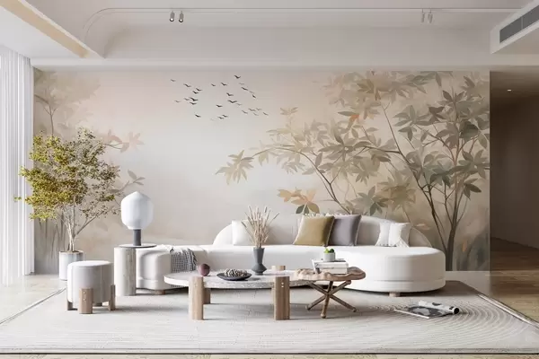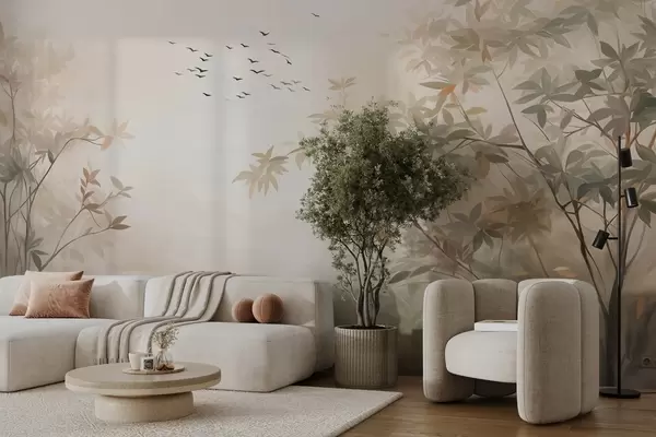 Fotobehang Landschap met textuur, bomen en een zwerm vogels die door de lucht vliegen, pastelkleuren, natuurtafereel N° w09418