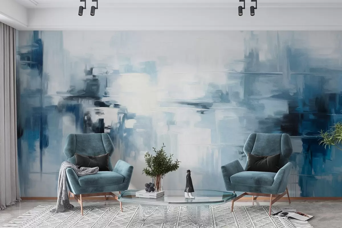 Fotobehang Abstracte imitatie van een landschapsschilderij met blauwe en witte penseelstreken, moderne stijl N° w09422