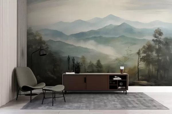 Fotobehang Mistige bergketen met bomen, mist, bewolkte lucht, gedempte kleuren, landschapsschilderstijl N° w09424