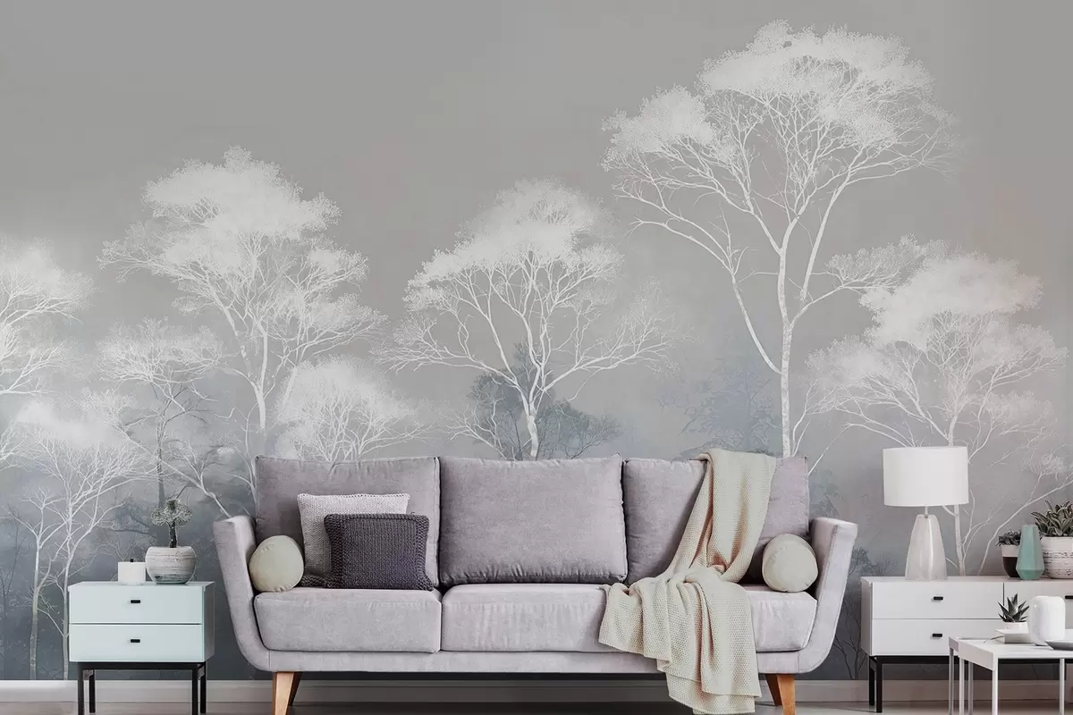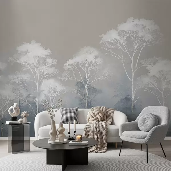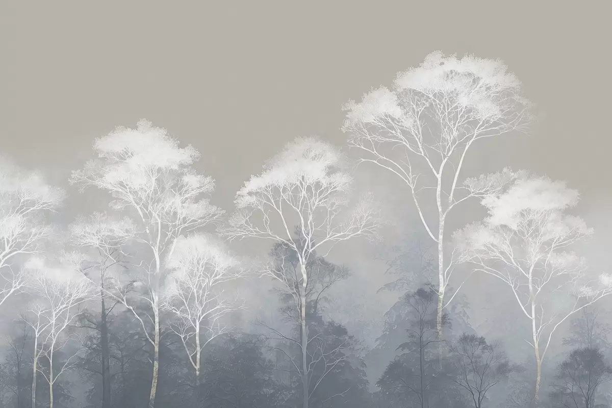 Fotobehang Minimalistische bomen in blauwgrijs palet, in mist N° w09448