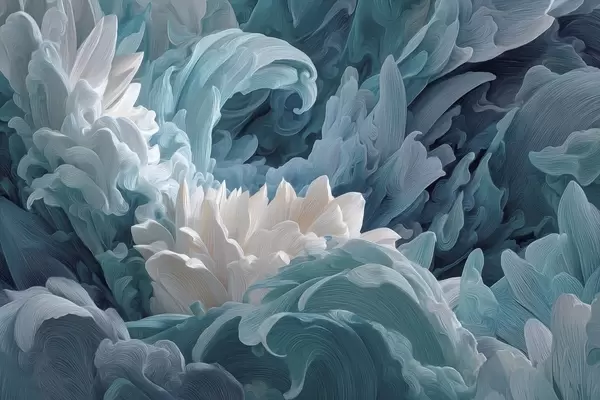 Fotobehang Dans van bloemblaadjes en oceaangolven in blauwe tinten N° w09454