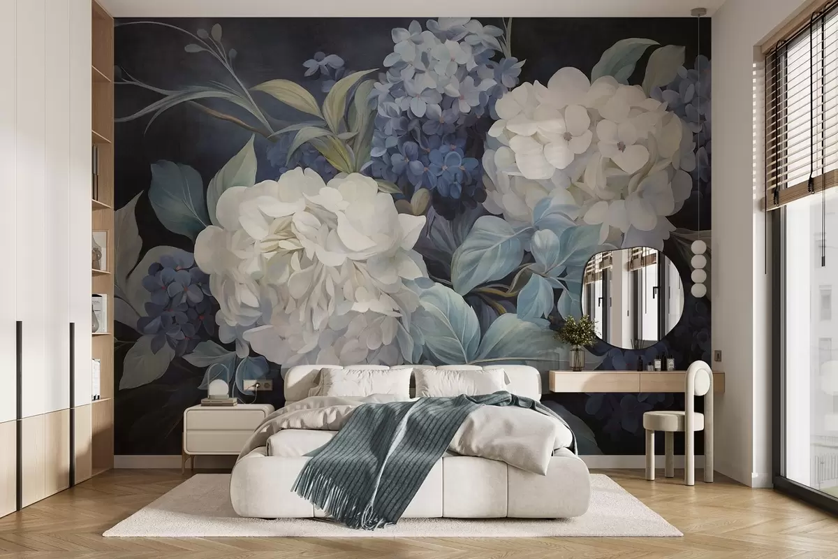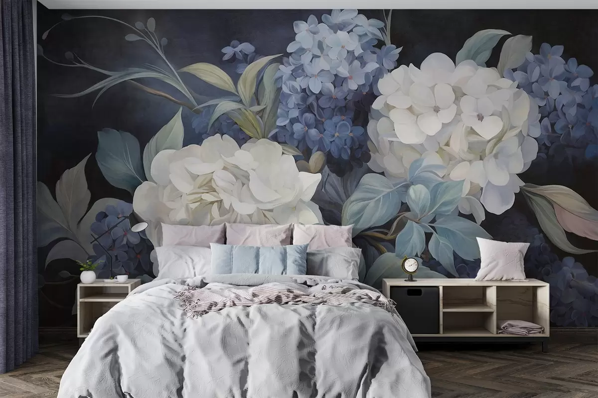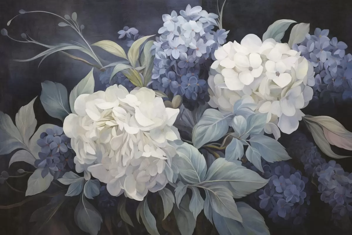 Fotobehang Getextureerde donkerblauwe schilderijimitatie van hortensiabloemen met grote bladeren, abstracte en donkere achtergrond N° w09465v1