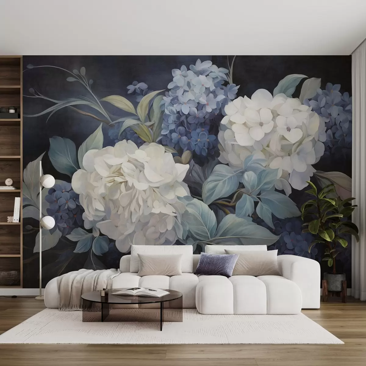 Fotobehang Getextureerde donkerblauwe schilderijimitatie van hortensiabloemen met grote bladeren, abstracte en donkere achtergrond N° w09465v1