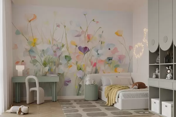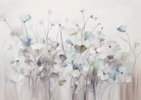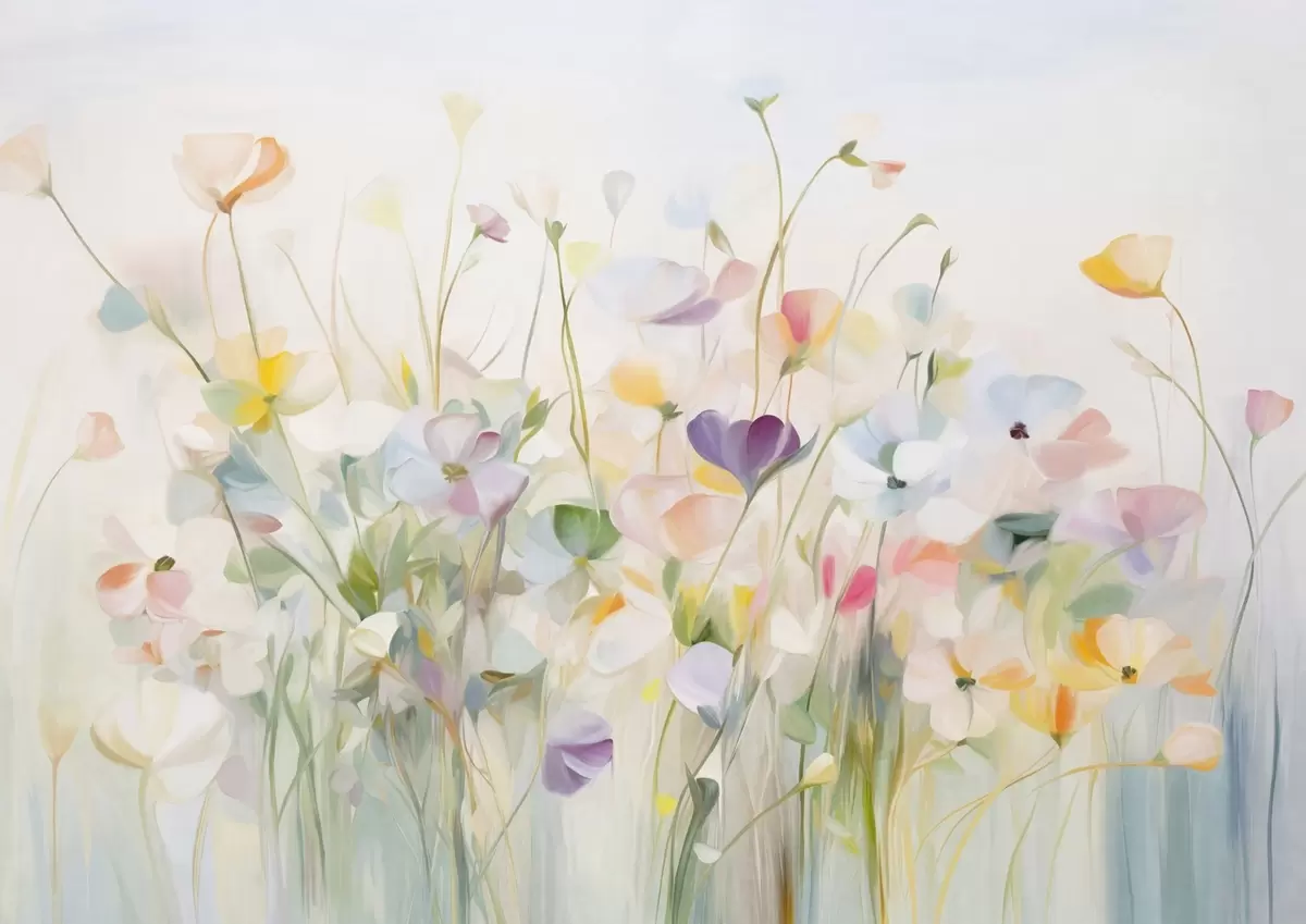 Fotobehang Abstract veld met kleurrijke bloemen met lange stelen en groene bladeren, gestructureerd, pastelkleuren, lichte kleuren N° w09466