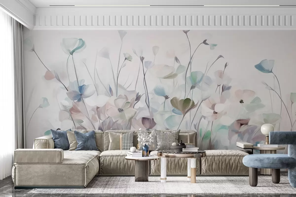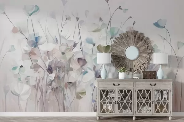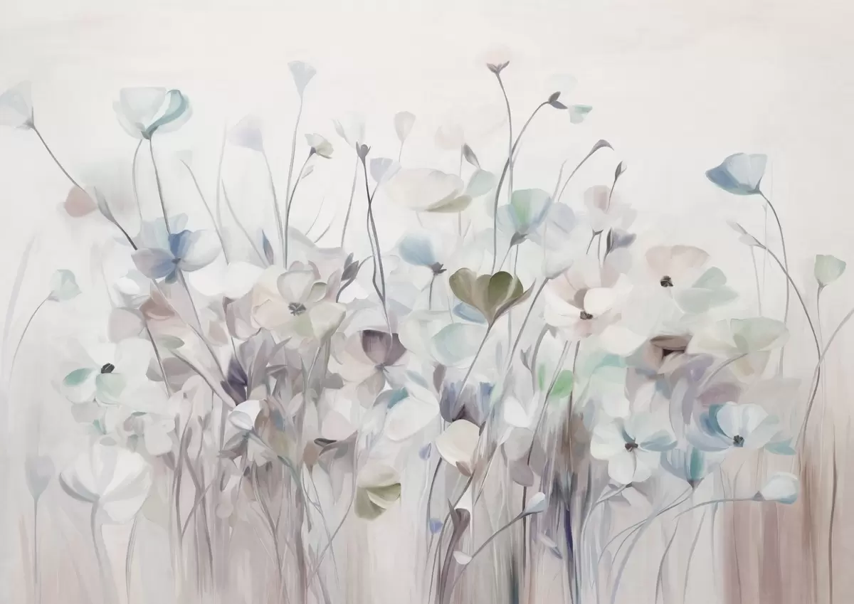 Fotobehang Abstract veld met blauwe en bruine bloemen met lange stelen en bladeren, gestructureerd, pastelkleuren, gedempte kleuren N° w09466v1