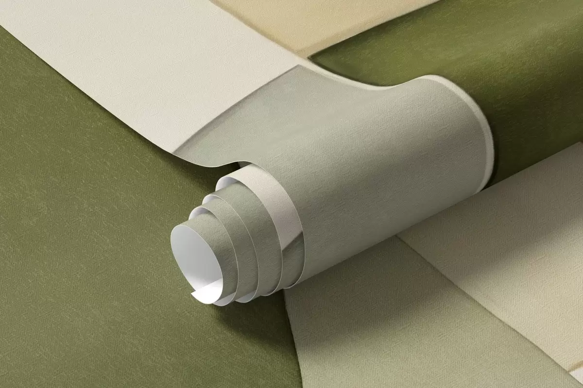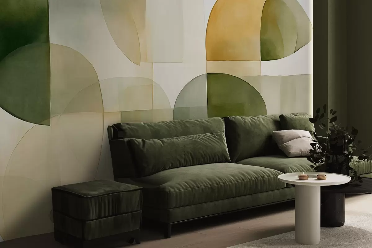 Fotobehang Abstracte vormen met textuur in groene en gele tinten, gedempte kleuren, minimalistische compositie, neutrale achtergrond N° w09467