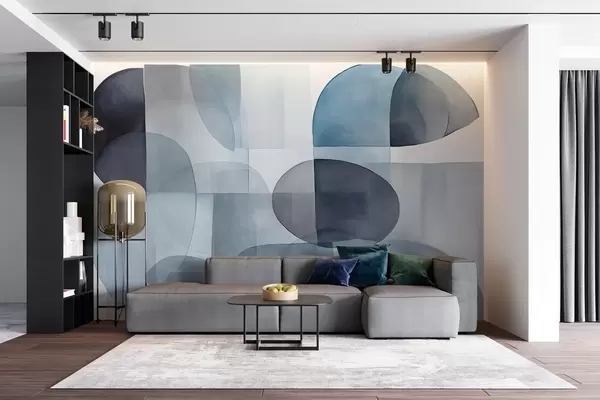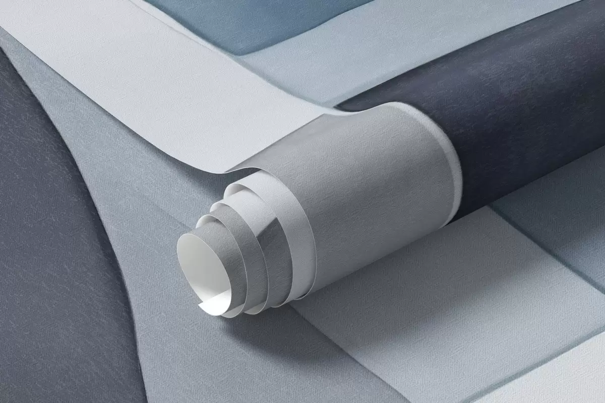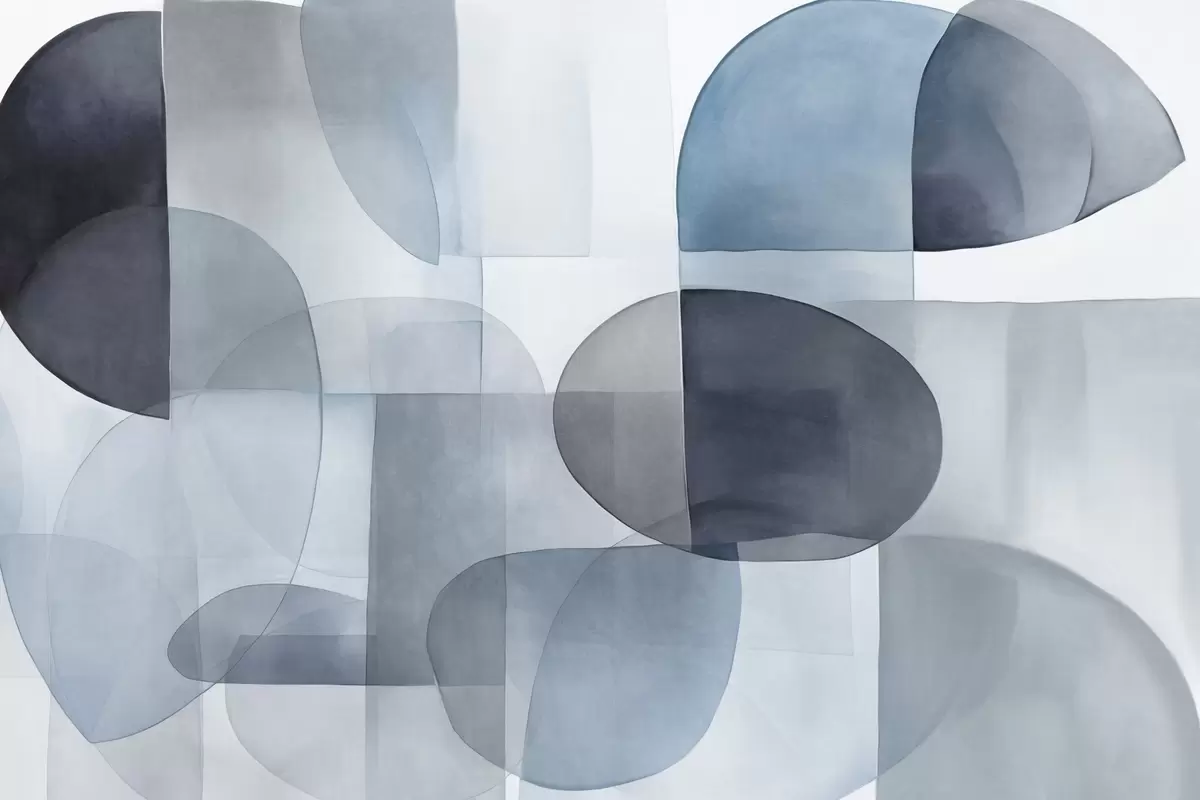 Fotobehang Abstracte vormen met textuur in grijstinten en blauwtinten, gedempte kleuren, minimalistische compositie, neutrale achtergrond N° w09467v1
