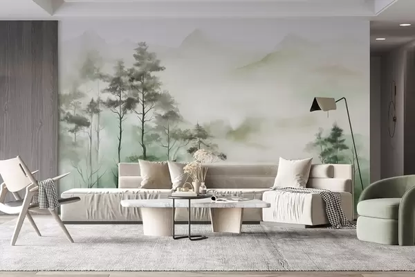 Fotobehang Mistig landschap met hoge bomen en bergen in gedempte groene en grijze tinten, minimalistische stijl, met textuur N° w09469