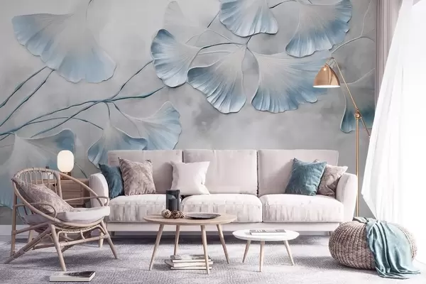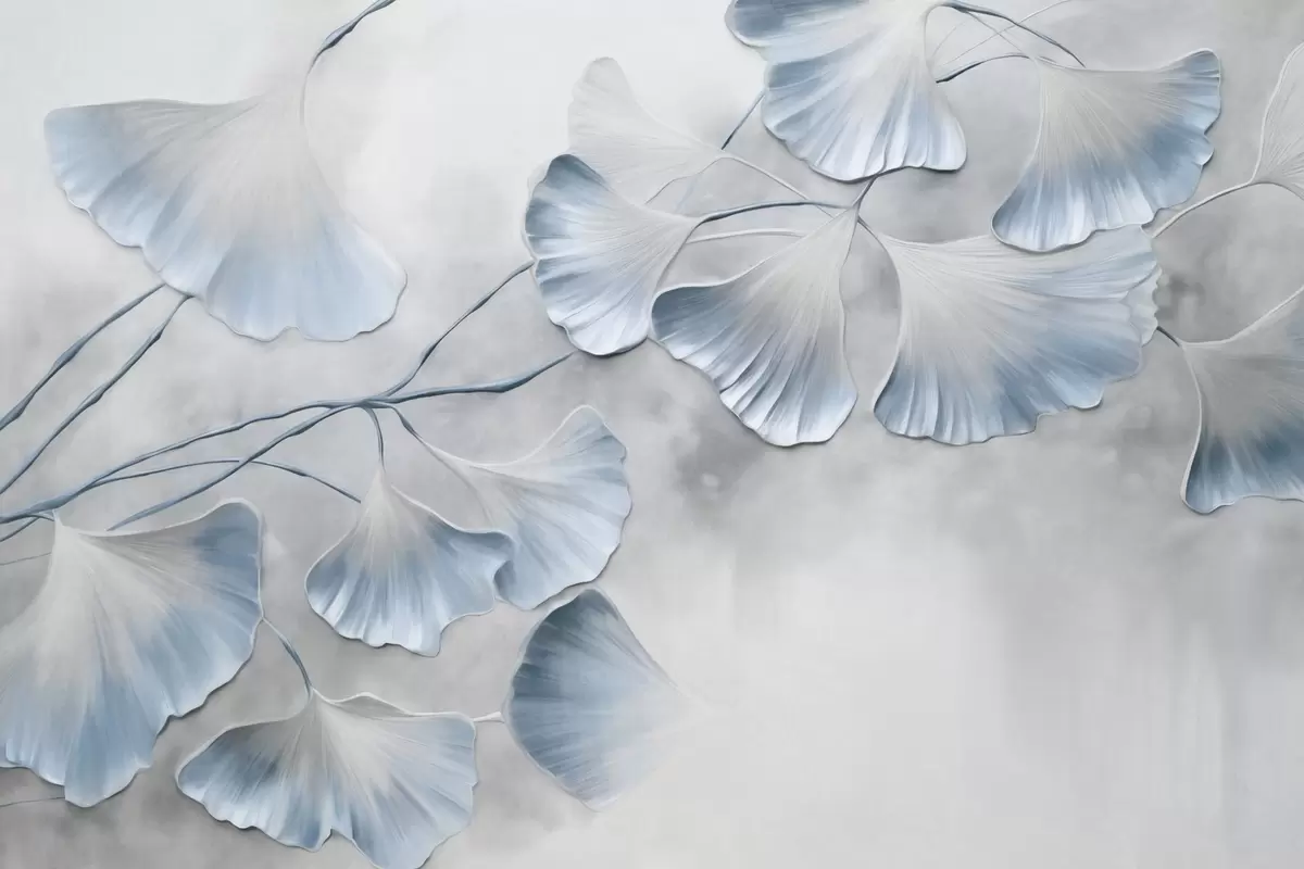 Fotobehang Ginkgo biloba-bladeren met blauwe randen op een tak, grijze gestructureerde achtergrond, elegant en minimalistisch ontwerp N° w09472v1
