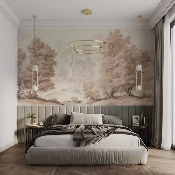 Fotobehang Textuurlandschapsschilderij dat een bos met hoge bomen en gras imiteert, gedempte en zachte kleuren, rustgevend tafereel N° w09474