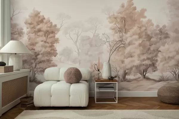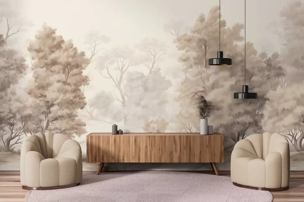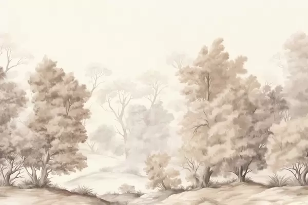 Fotobehang Textuurlandschapsschilderij dat een bos met hoge bomen en gras imiteert, gedempte en zachte kleuren, rustgevend tafereel N° w09474