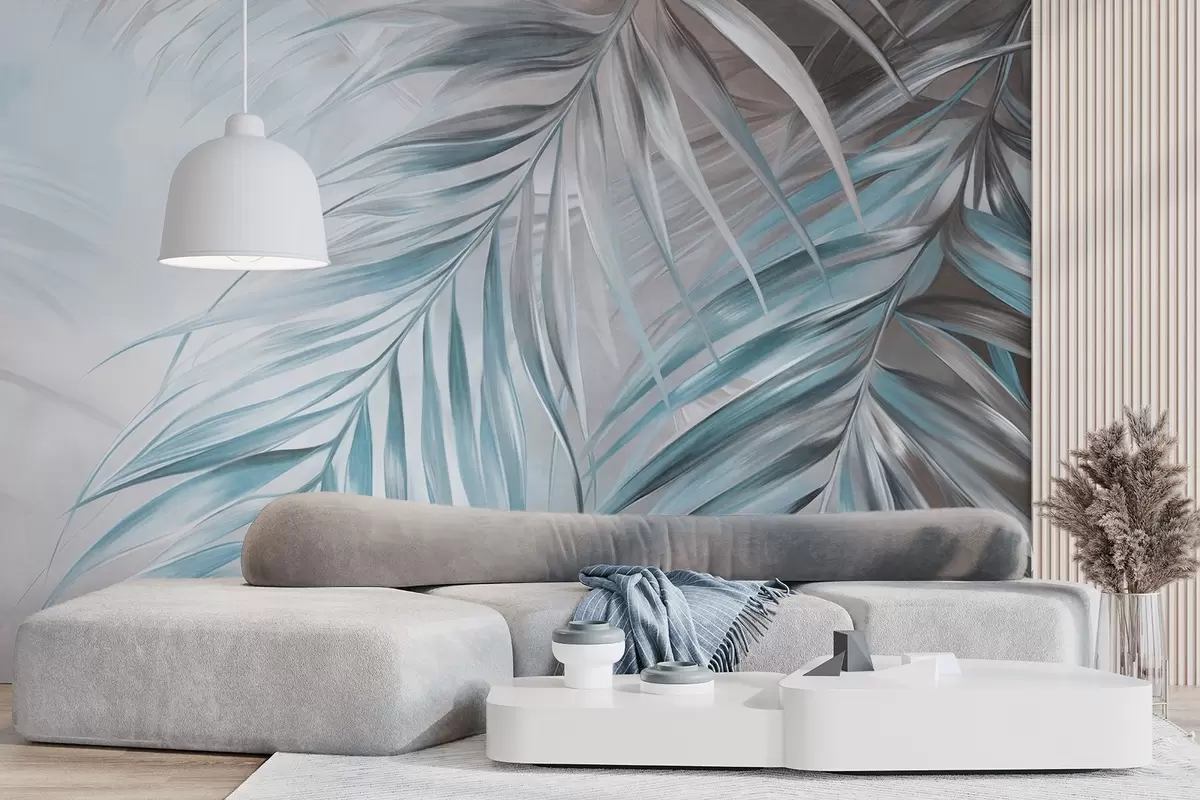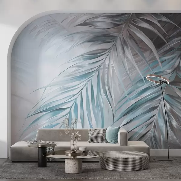 Fotobehang Palmbladeren met grijze en blauwe tinten, lichte gestructureerde achtergrond met zachte kleuren, elegante tropische stijl N° w09475v1