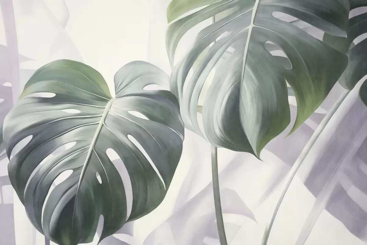 Fotobehang Getextureerde monstera-bladeren, groot en groen, tegen een zachte, lichte abstracte achtergrond N° w09477