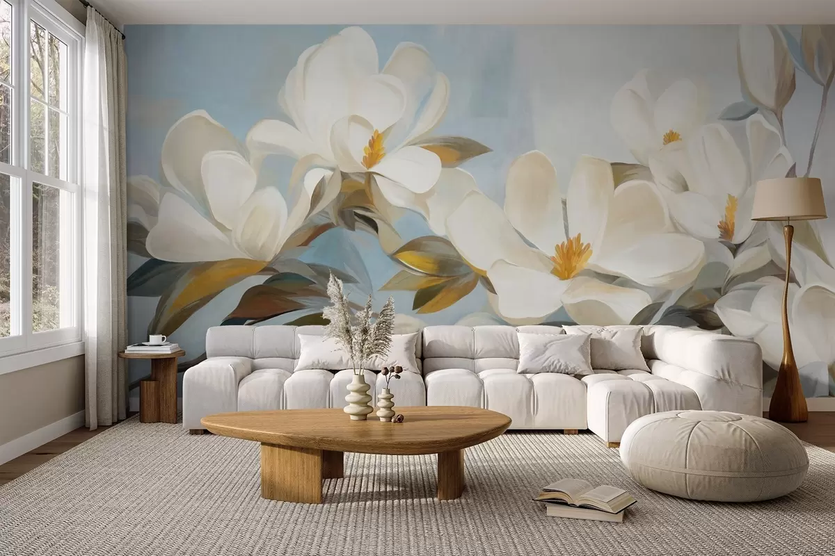 Fotobehang Witte magnolia's met groene bladeren op een lichtblauwe achtergrond met abstracte penseelstreken imitatie N° w09478